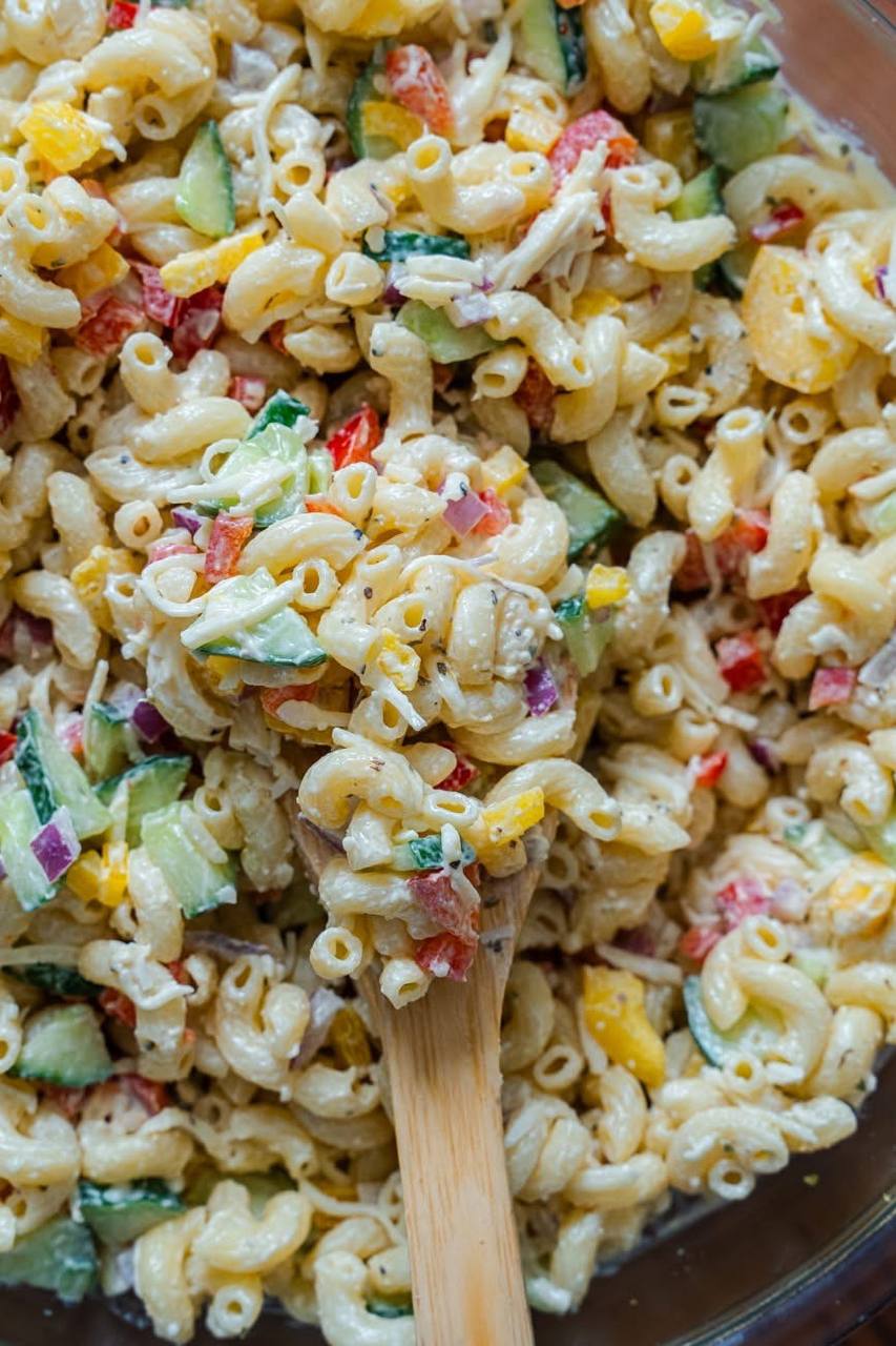 6. Gently fold all the ingredients together with a large spoon or spatula until the pasta and vegetables are evenly coated with the creamy dressing. Make sure to scrape the bottom and sides of the bowl to ensure everything is incorporated.
