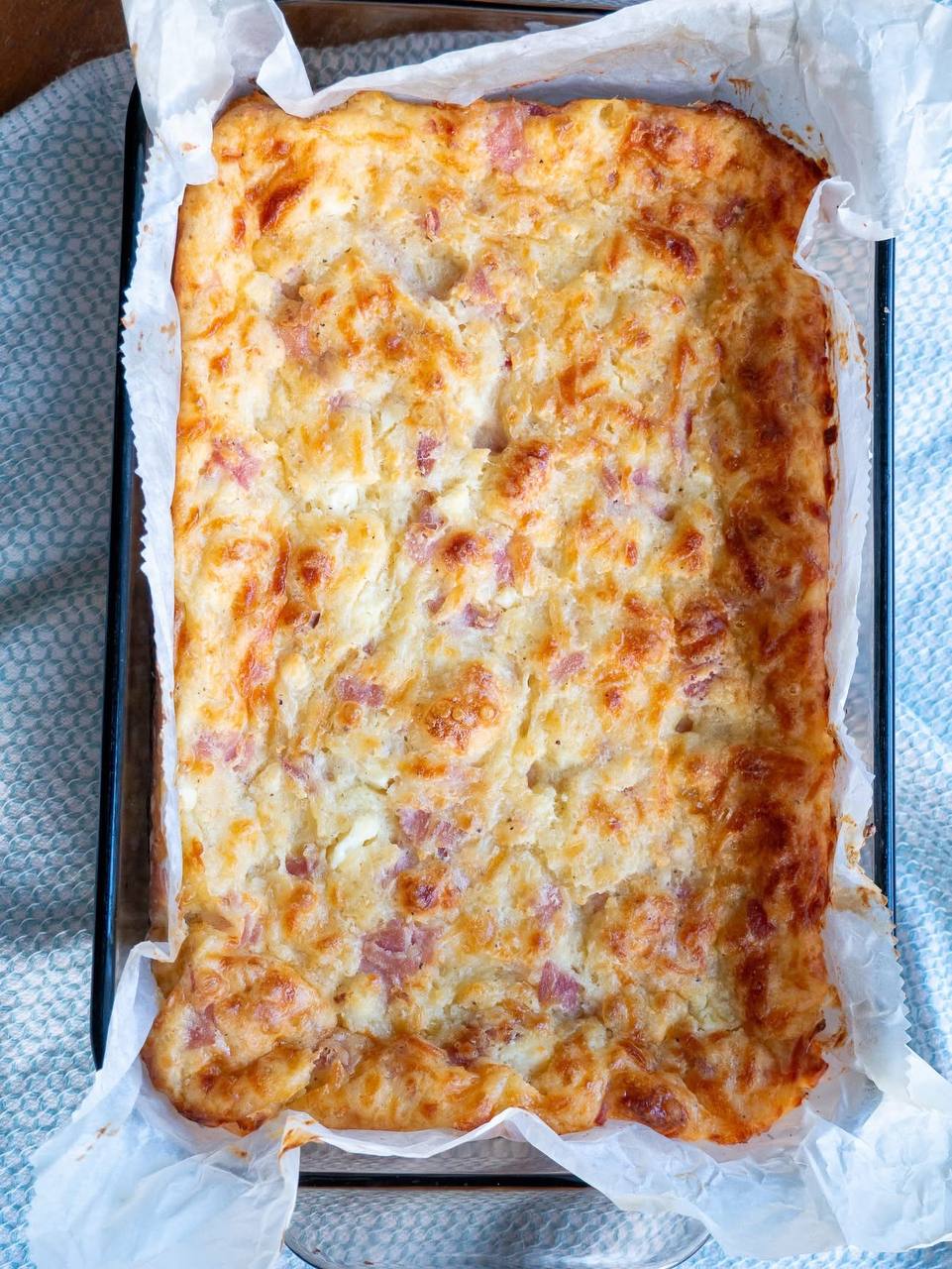 - Distribute the diced ham evenly over the potato layer.