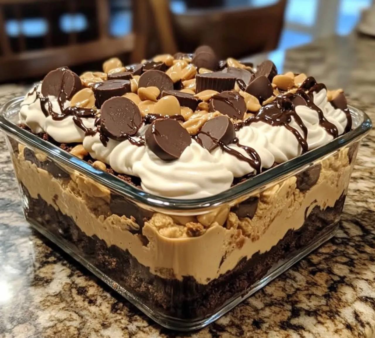 - Generously sprinkle the chopped mini peanut butter cups and chopped roasted peanuts over the whipped topping. For the final touch, drizzle chocolate syrup or melted chocolate in a decorative pattern over the entire surface.