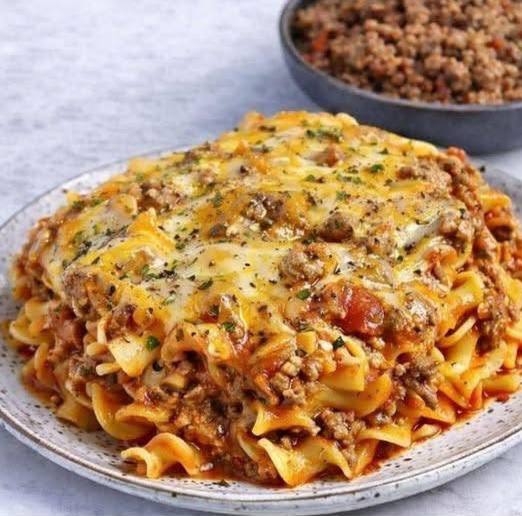 - Sprinkle half of the remaining meat sauce (the portion not mixed with noodles) over the noodle layer.