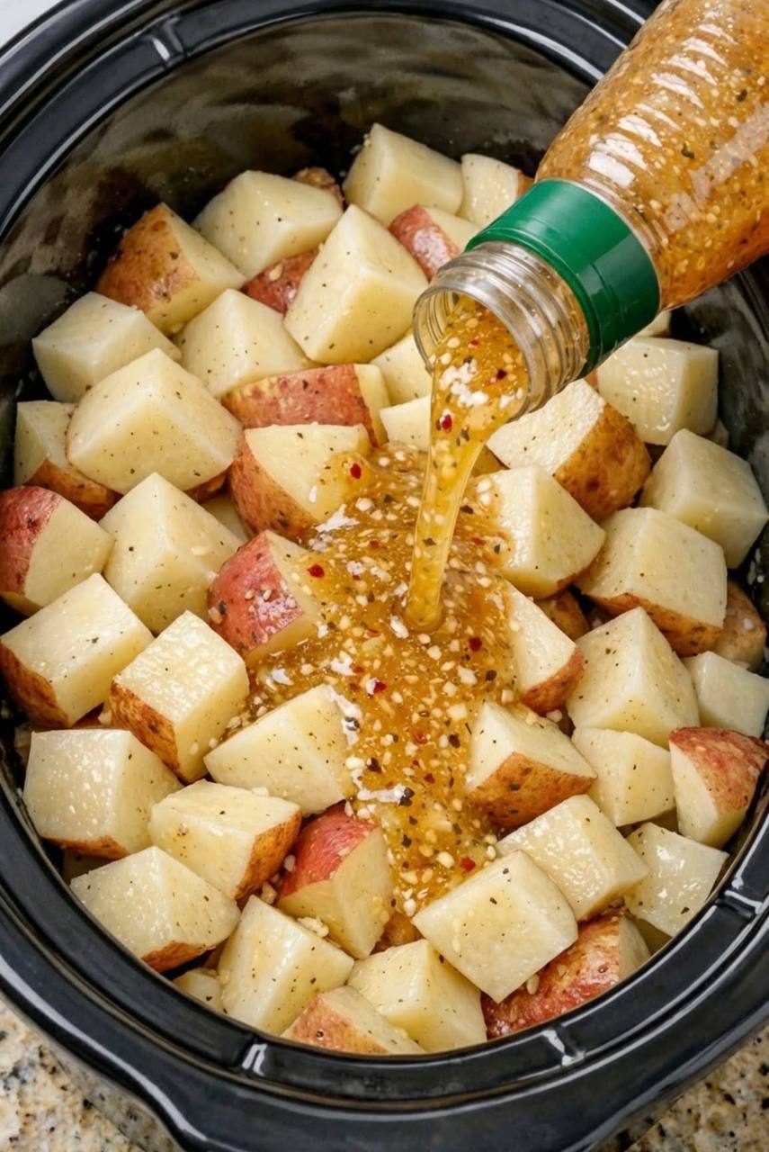 - Load the Slow Cooker: Pour the seasoned potatoes into the slow cooker. Pour the chicken or vegetable broth (or water) over the potatoes. This liquid helps prevent sticking and creates steam for tender cooking.