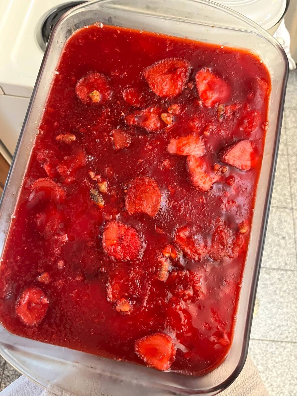 - If using chopped nuts, sprinkle them evenly over the strawberry layer.